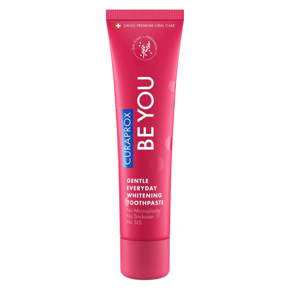 CURAPROX Be You to nowoczesna pasta do zębów o smaku dżin-toniku i hurmy, która łączy świeżość z delikatnym działaniem czyszczącym. Niski RDA ≈ 50 sprzyja łagodnej pielęgnacji szkliwa, a starannie dobrane składniki pomagają usuwać powierzchowne osady i wspierać naturalnie jasny wygląd zębów. Formuła została opracowana z myślą o codziennym komforcie jamy ustnej i świeżym oddechu.