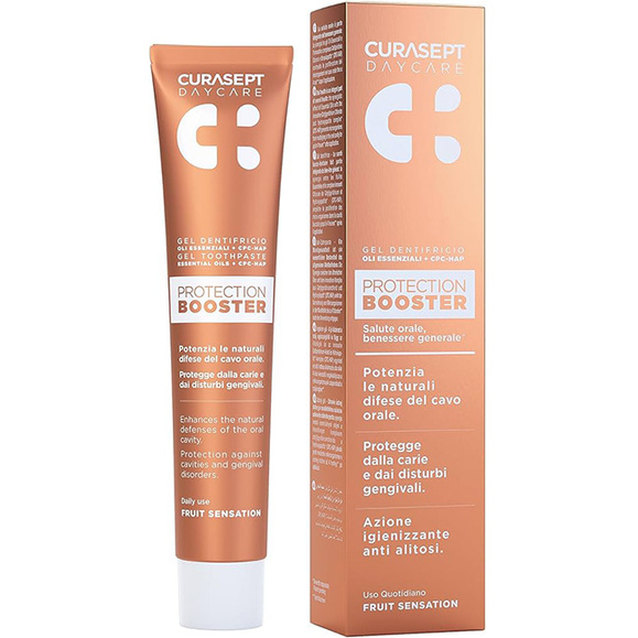 Curasept Daycare Booster Fruit Sensation to nowoczesna pasta do zębów z kompleksem CPC-HAP, stworzona do codziennej pielęgnacji jamy ustnej dorosłych i dzieci od 7. roku życia. Formuła wspiera ochronę szkliwa i pomaga ograniczyć odkładanie się płytki nazębnej. Owocowy smak sprawia, że szczotkowanie jest przyjemne i zachęca do regularnego stosowania.