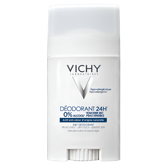Vichy Deodorant 24H to dezodorant w sztyfcie, który zapewnia ochronę przed potem i nieprzyjemnym zapachem do 24 godzin. Formuła została opracowana, aby wspierać utrzymanie świeżości i komfortu skóry przez cały dzień, pozostając delikatna dla wrażliwych okolic. Produkt nie pozostawia śladów na ubraniach i doskonale sprawdza się w codziennym stosowaniu, zapewniając uczucie czystości i suchości.