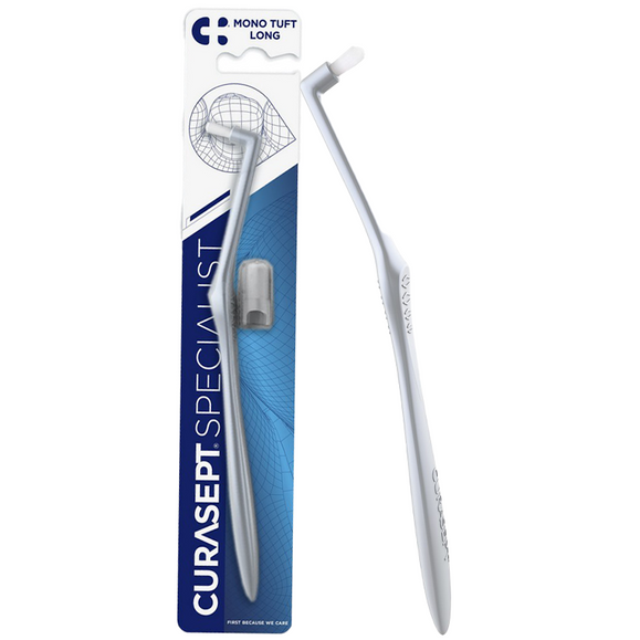 Szczoteczka do zębów Curasept Mono Tuft Long to specjalistyczna szczoteczka jednopęczkowa przeznaczona do precyzyjnego czyszczenia trudno dostępnych miejsc w jamie ustnej. Pojedynczy, stożkowy pęczek miękkiego włosia ułatwia pielęgnację okolic aparatów ortodontycznych, implantów, mostów oraz pojedynczych zębów. Ergonomiczny, wydłużony uchwyt zapewnia wygodę manewrowania, dzięki czemu szczoteczka sprawdza się jako uzupełnienie codziennej higieny jamy ustnej.