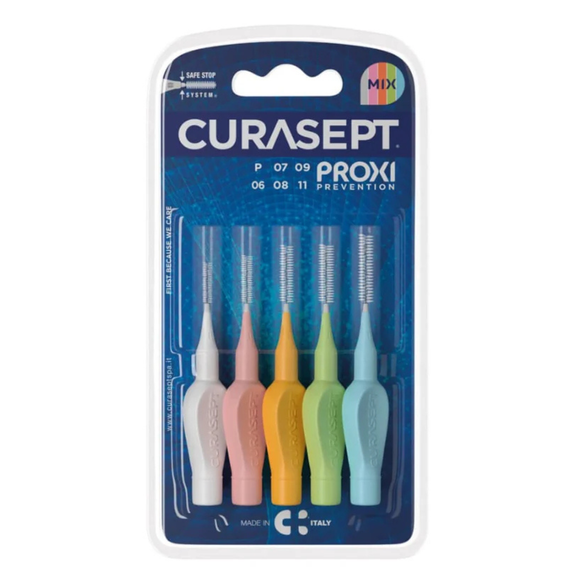Curasept Proxi Prevention Mix to zestaw 5 szczoteczek międzyzębowych zaprojektowanych do dokładnego oczyszczania przestrzeni między zębami, gdzie nie dociera tradycyjna szczoteczka. Produkt wspiera codzienną higienę jamy ustnej, pomagając utrzymać czystość i zdrowy wygląd dziąseł. Dzięki zróżnicowanym rozmiarom (0,6–1,1 mm) szczoteczki można dopasować do indywidualnych potrzeb, co zapewnia skuteczne i komfortowe czyszczenie trudno dostępnych miejsc.