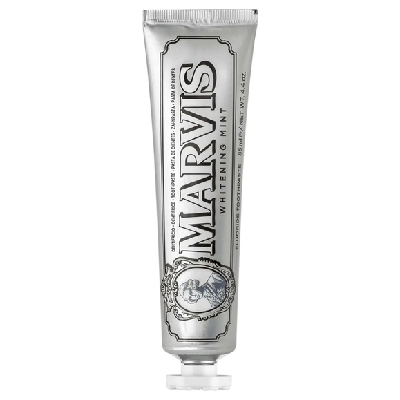 Marvis Whitening Mint to wybielająca pasta do zębów z fluorem, która łączy skuteczną codzienną higienę jamy ustnej z intensywnie odświeżającym smakiem mięty. Kremowa formuła pomaga usuwać osad i powierzchniowe przebarwienia szkliwa, wspierając jaśniejszy, zadbany wygląd zębów. Produkt został opracowany z myślą o osobach, które cenią wysoką jakość, elegancki design oraz wyjątkowe doznania podczas szczotkowania.