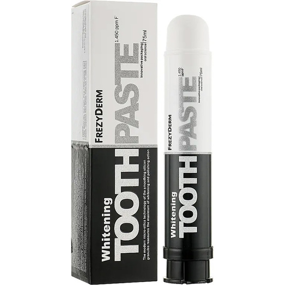 FREZYDERM Whitening to pasta do zębów wybielająca opracowana z myślą o skutecznym usuwaniu przebarwień spowodowanych kawą, herbatą, papierosami i napojami gazowanymi. Dzięki innowacyjnej technologii mikro-krzemionki z patentowanymi granulkami silikonowymi delikatnie poleruje powierzchnię zębów, pomagając przywrócić im naturalną biel i połysk. Produkt wspiera codzienną higienę jamy ustnej, chroniąc szkliwo i zapewniając długotrwałe uczucie świeżości.